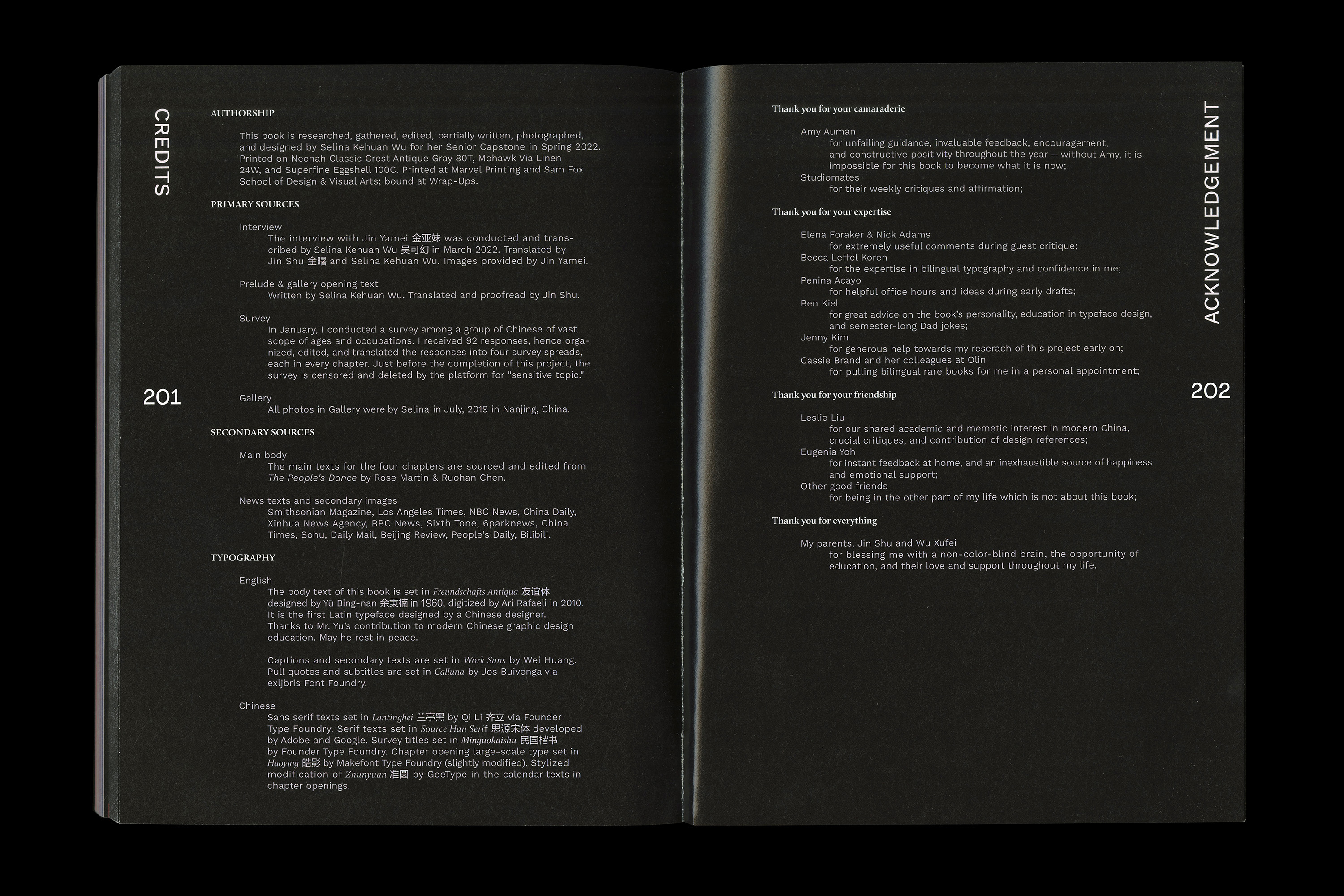 This 200-page book observes and examines public square dance, a folk pastime among older Chinese people in public squares, through design, research, gathering, interview, survey, and original photography. The book took inspiration from modern and traditional Chinese culture and the movement of dancing. It uses public square dance as a journalistic lens to gaze into the culture, history, politics/propaganda, as well as gender and aging issues in modern China.