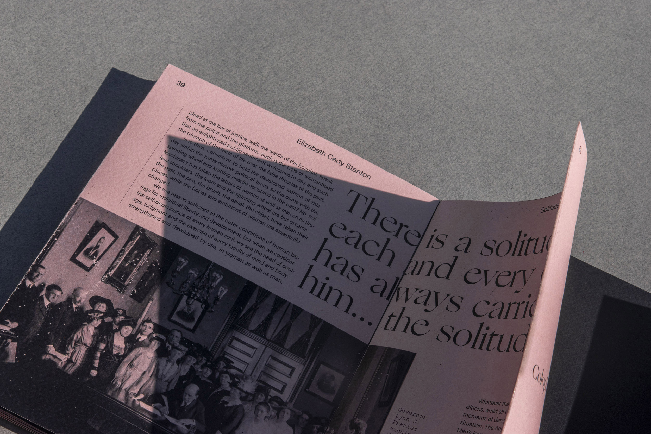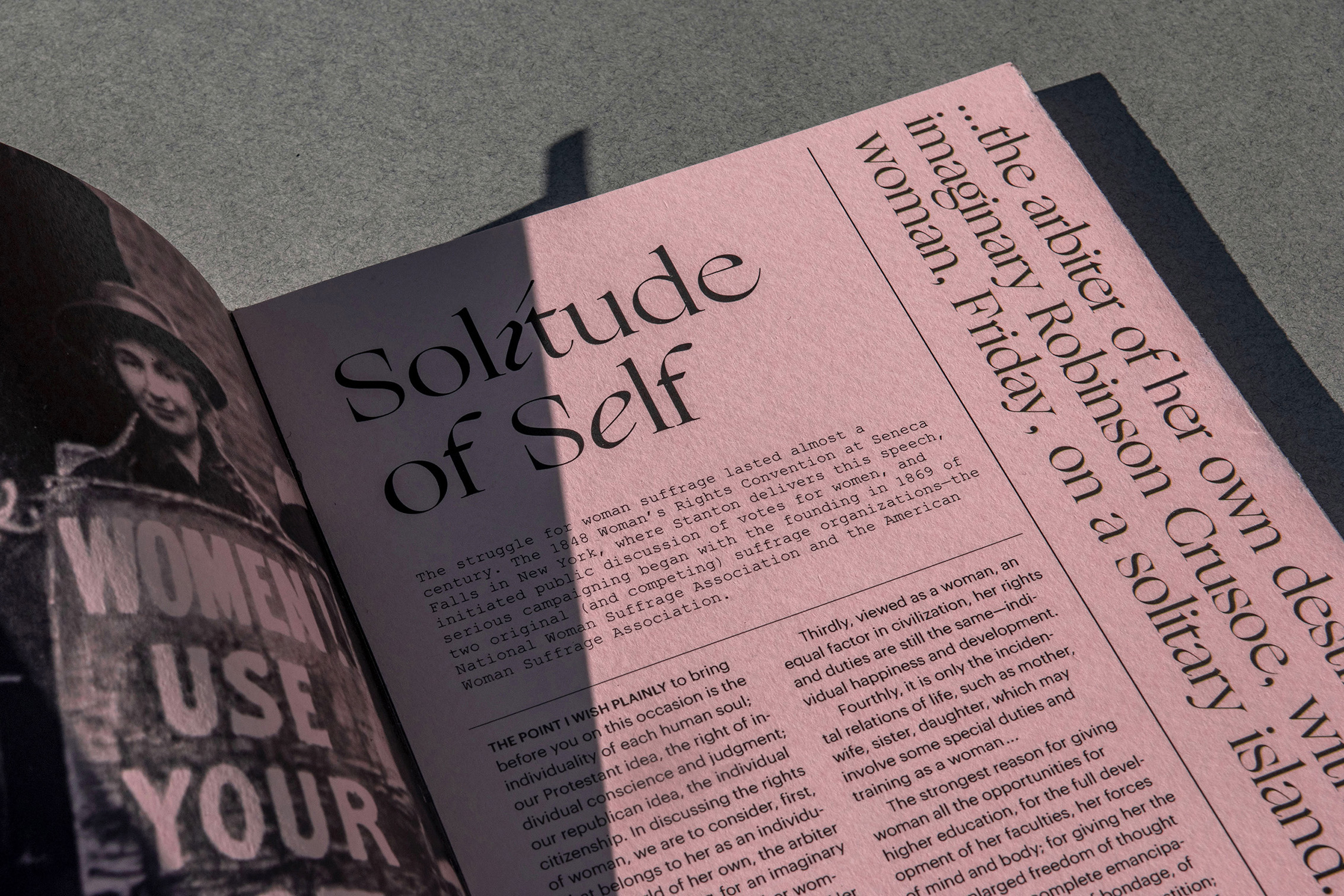 This editorial design is based on the powerful speech Solitude of Self delivered by the suffrage pioneer Elizabeth Cady Stanton in 1892, a classic argument for why women need to be enfranchised by a Sixteenth Amendment.